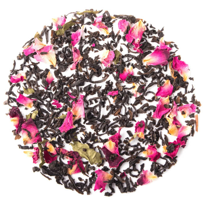 Green tea leaves, rose petals, hibiscus, lemongrass, and natural rose flavor.
